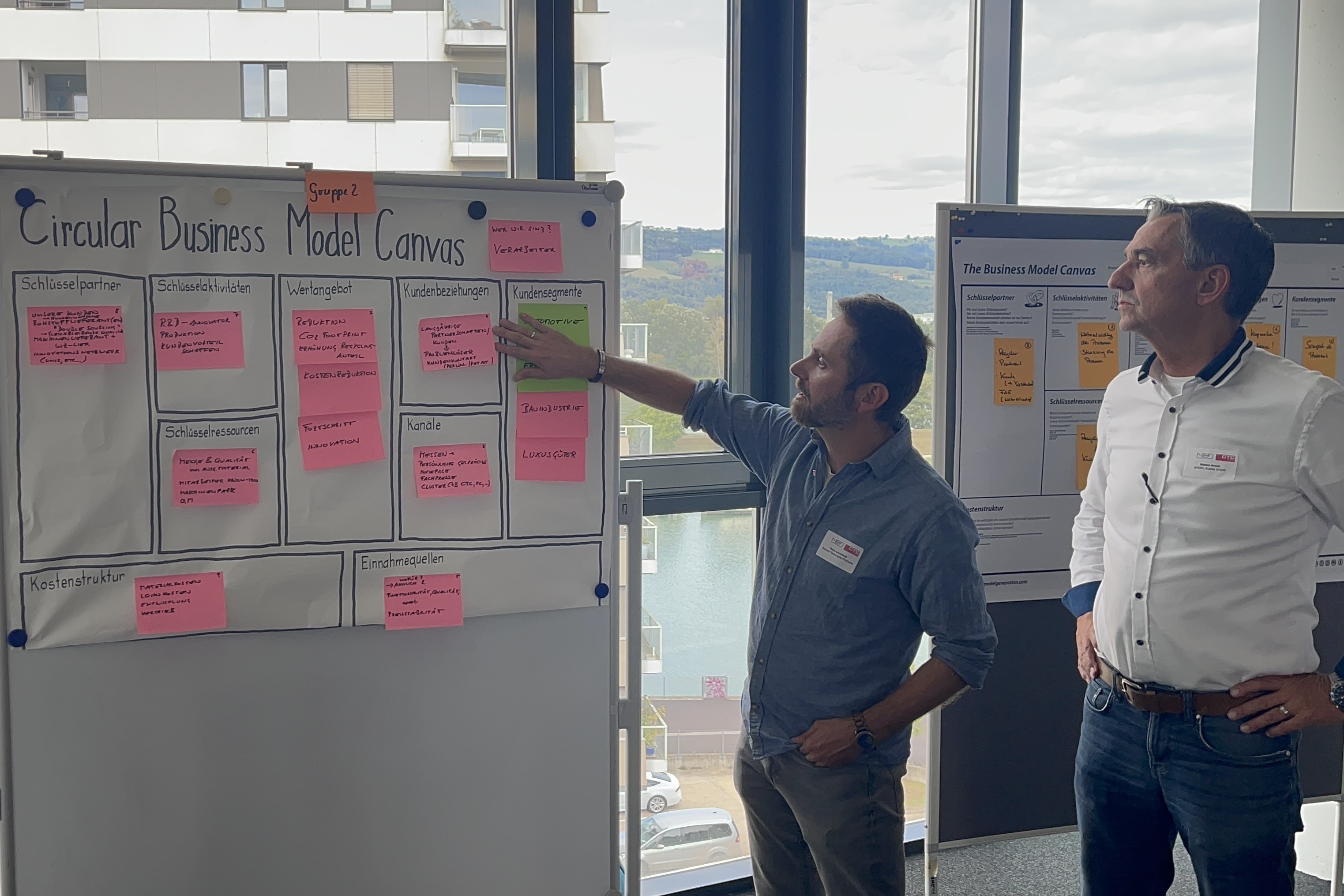 Im Anschluss wurden die Erkenntnisse vertieft und in einem gemeinsamen Business Model Canvas weiterentwickelt. Aus Perspektive von Schlauchherstellern, Verarbeitern, Recyclern und HANSA-FLEX selbst wurden Nutzenversprechen, Schlüsselaktivitäten und Kooperationsmodelle erarbeitet. Im Mittelpunkt standen Ressourcenschonung, CO₂-Reduktion, Entsorgungskosten, Innovationsdruck sowie die steigenden Anforderungen an nachhaltige Lieferketten.
